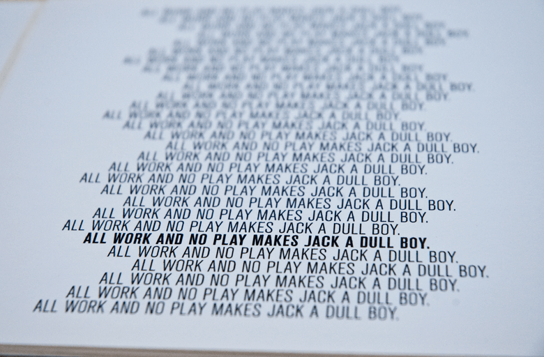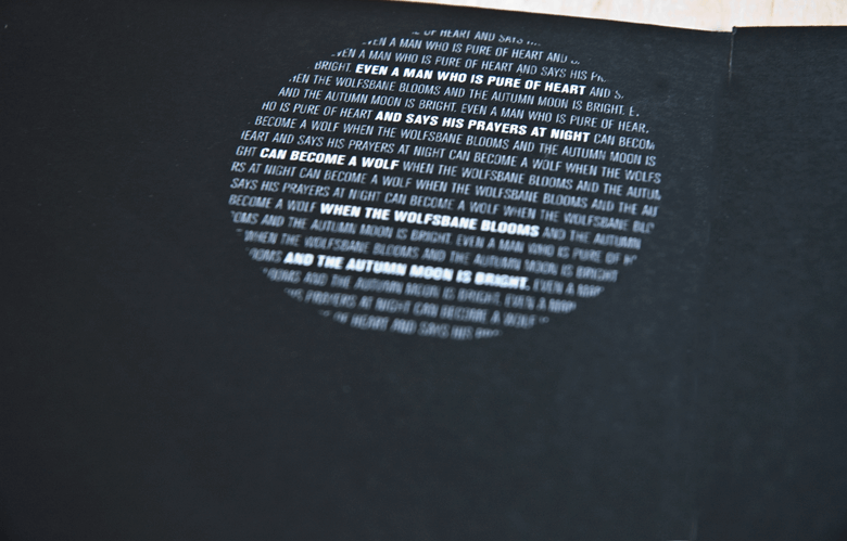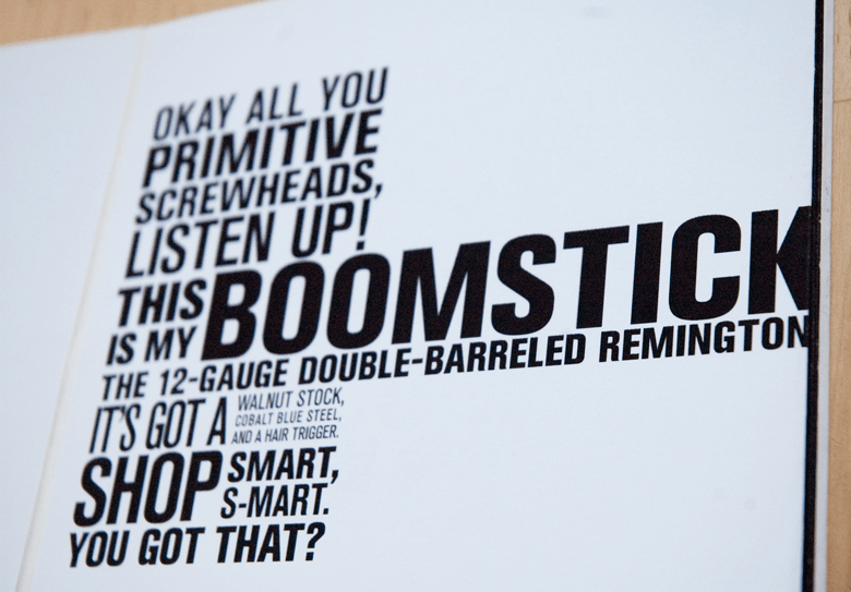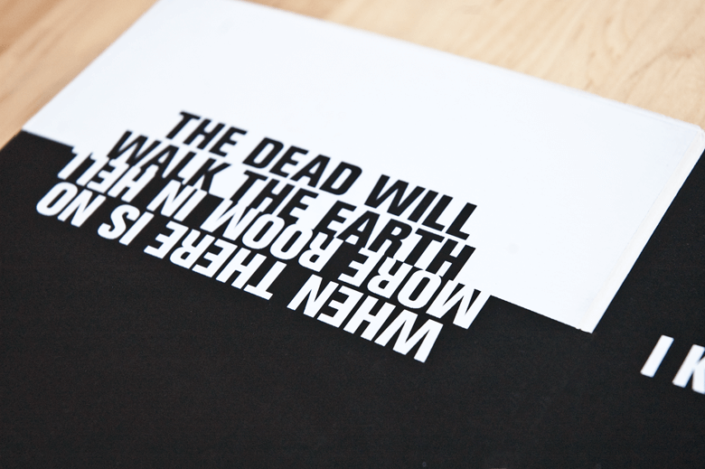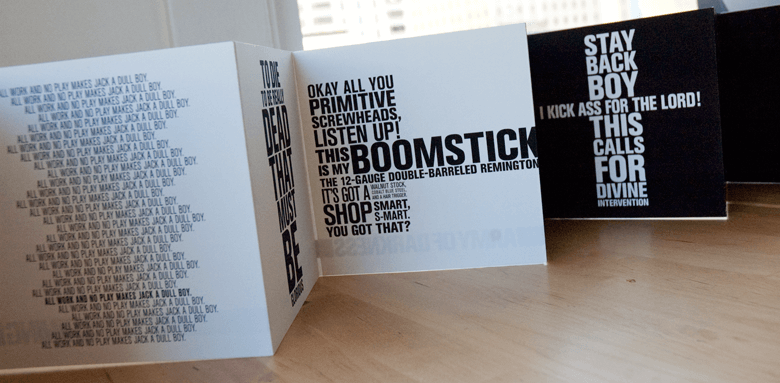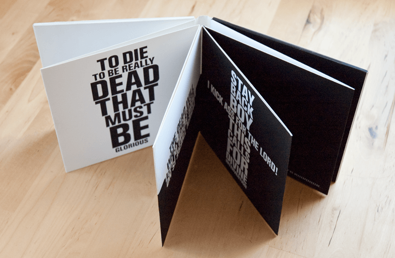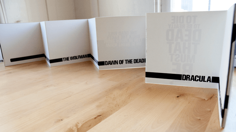 A handmade accordion-bound black and white typography book with a removeable spine card featuring quotes from Army of Darkness, Dawn of the Dead, Dead Alive, Dracula, The Wolfman, The Shining, and Poltergeist.