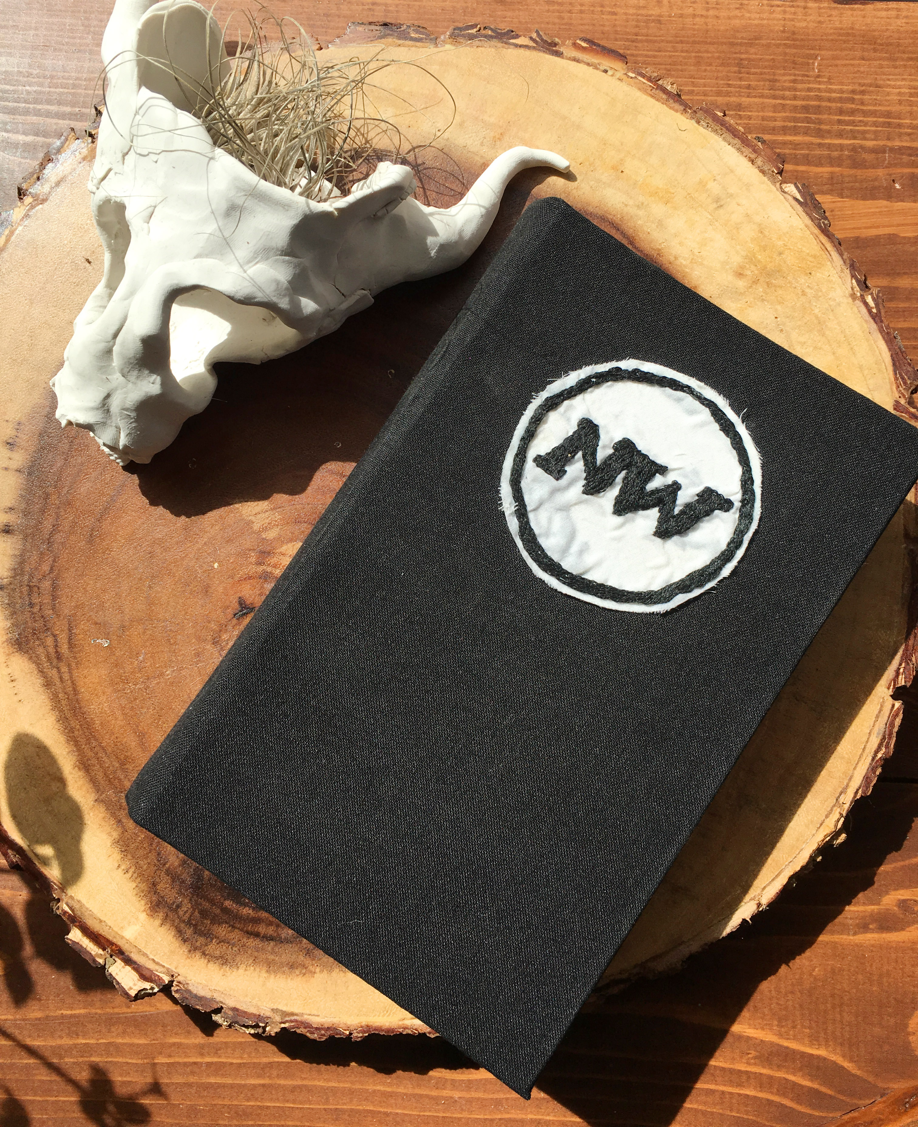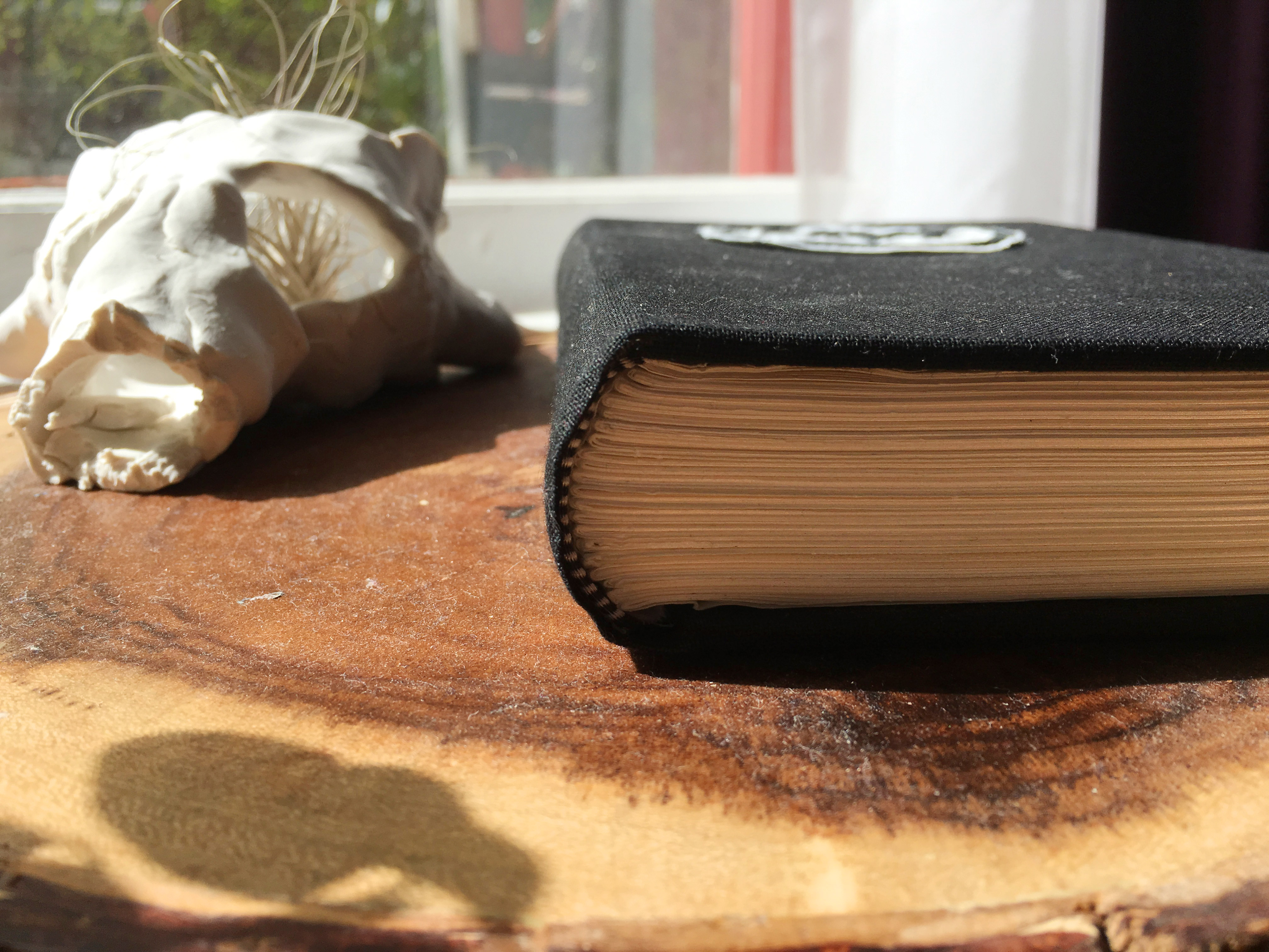 Clay skull, 2018. Journal, 2013. Journal is casebound, embroidered patch, ribbon bookmark, hammered and rounded spine.