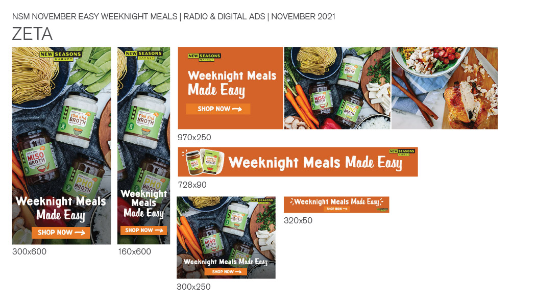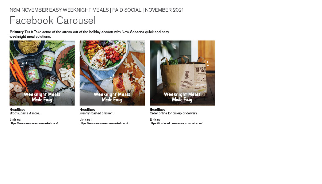 Over the last three years, I’ve been lucky enough to work on dozens of paid media flights for New Seasons Market spanning all sorts of subjects including sales, sustainability efforts, loyalty program initiatives, and Instacart promos. These flights vary a little in content, but generally include social media posts for Instagram, Facebook and Pinterest, brief motion graphics pieces for use on social and digital channels, sponsored social & editorial packages for local media outlets, and banner ads.