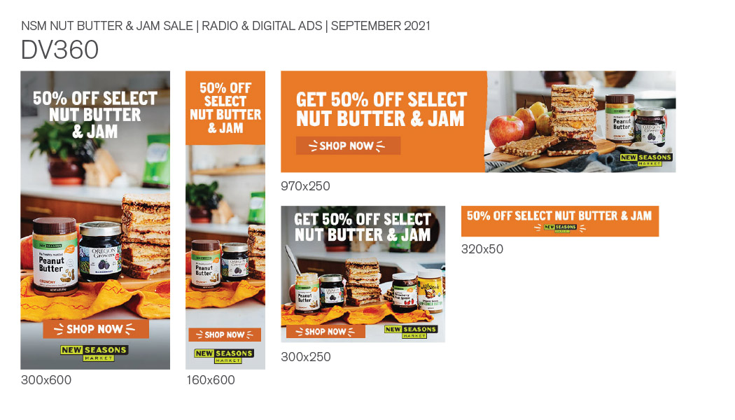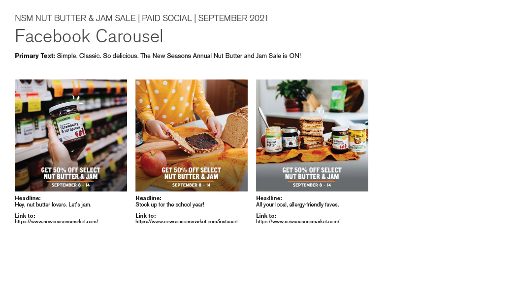 A paid social & digital ad campaign for New Seasons Market's annual nut butter & jam sale.