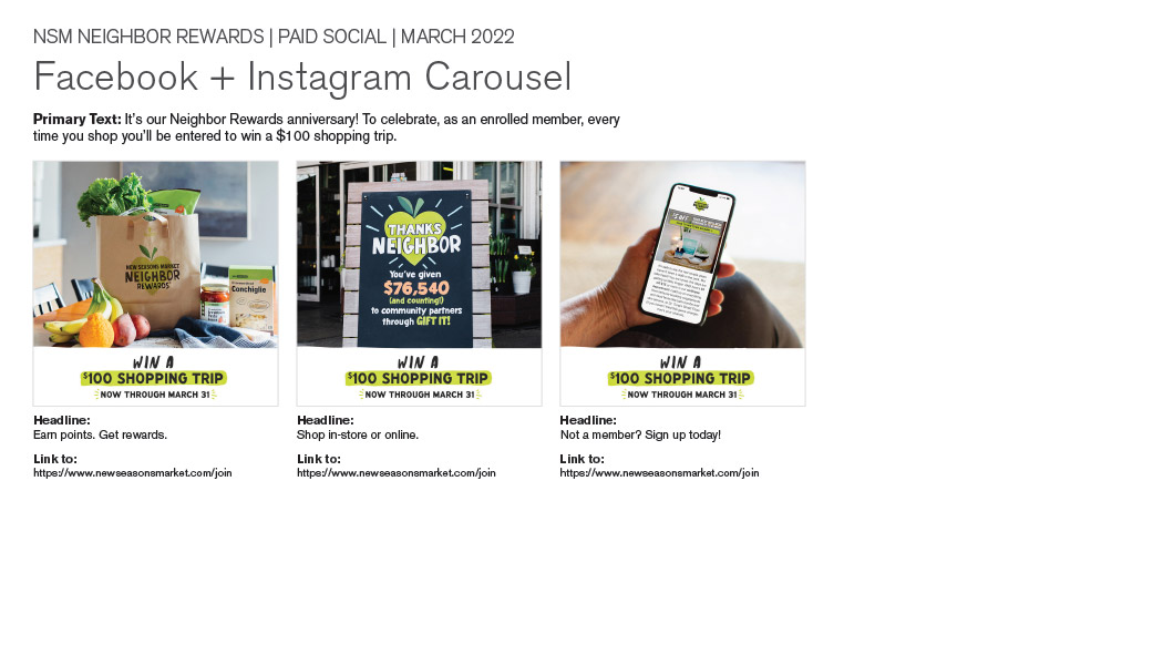 A paid social campaign promoting a sweepstakes for New Seasons Market's Neighbor Rewards loyalty program.