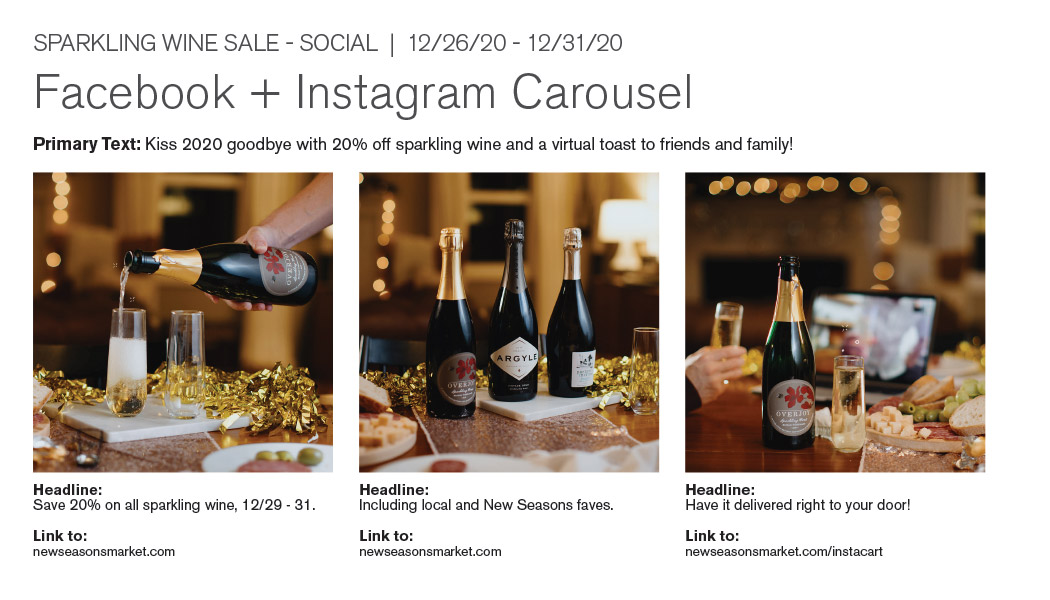 A paid social campaign for New Seasons Market's annual sparkling wine sale.
