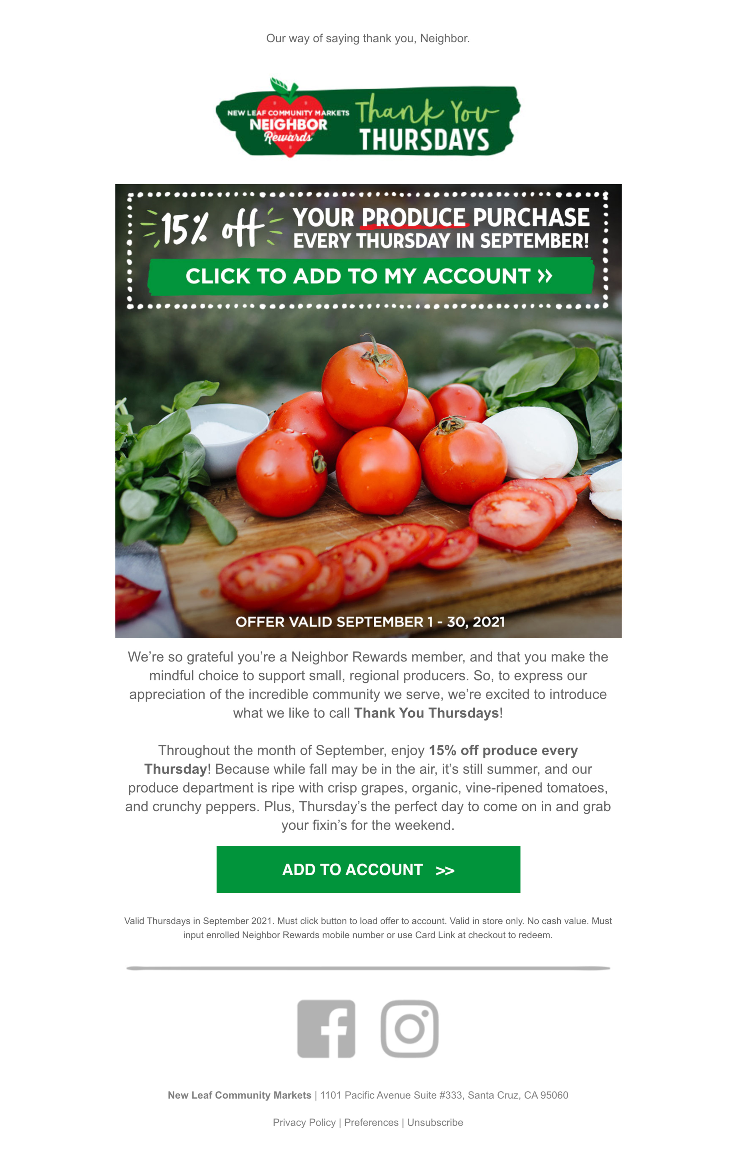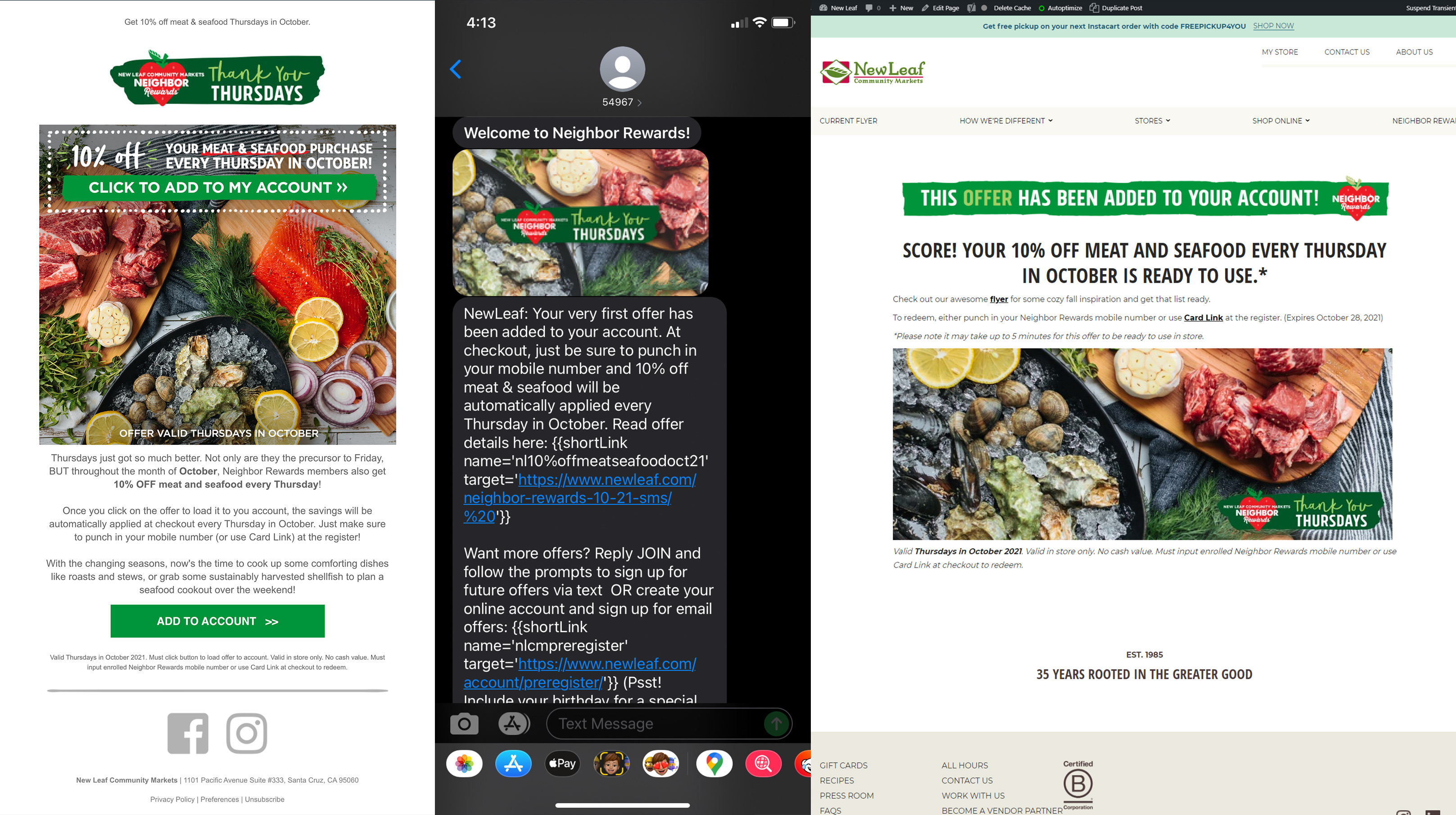 Full set of New Leaf Community Markets Thank You Thursday communcations: email, MMS, and landing page.