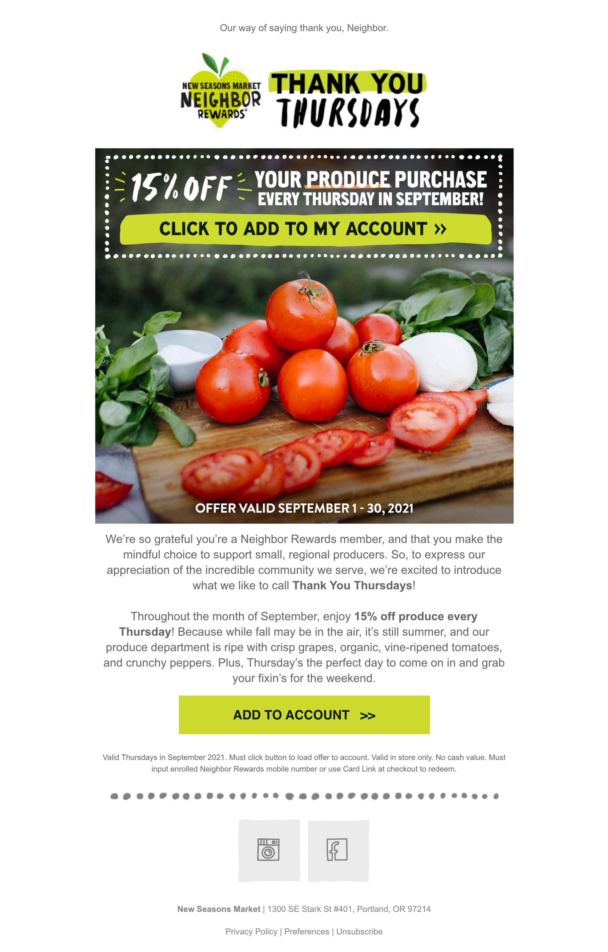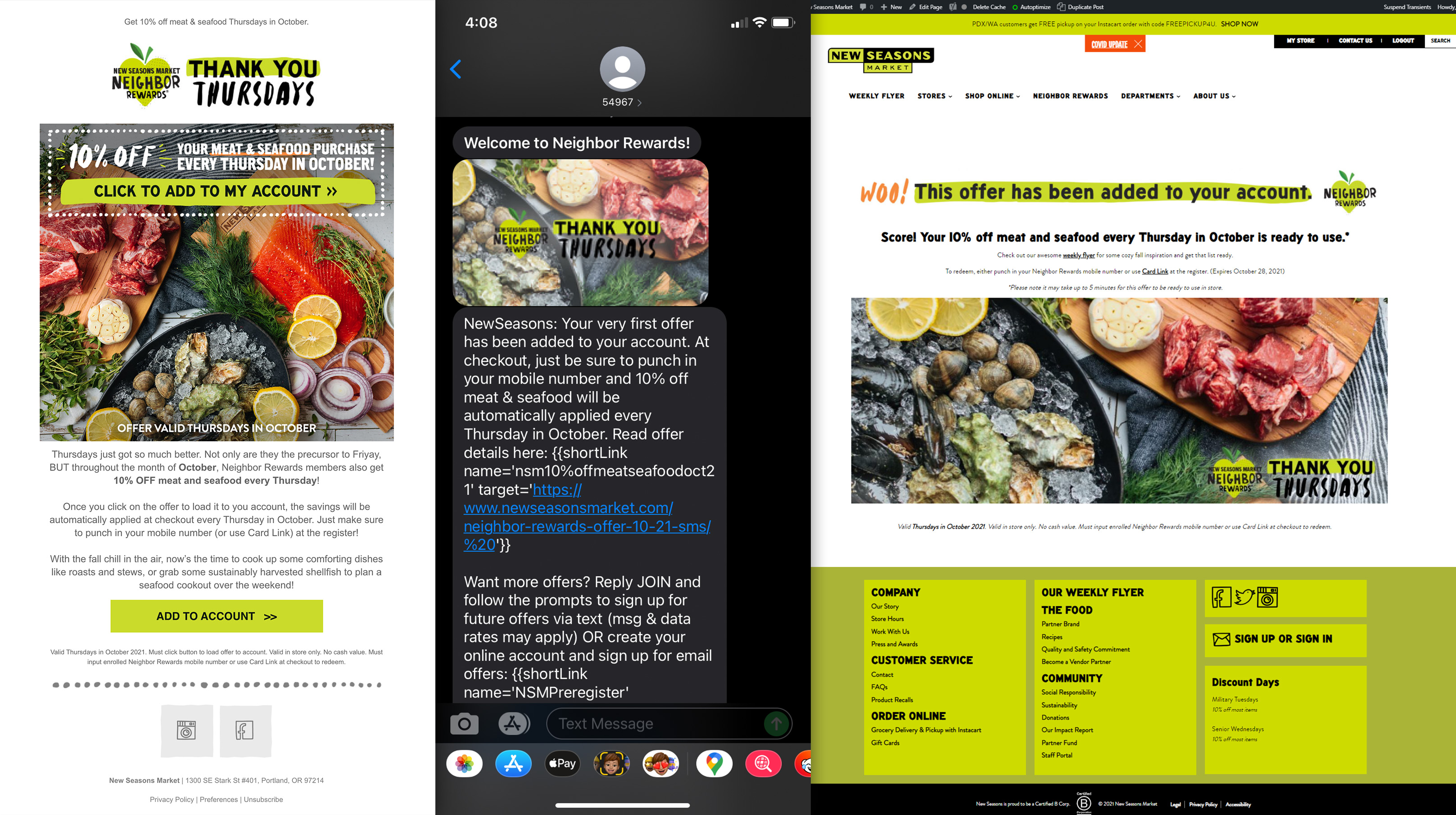 Full set of New Seasons Market Thank You Thursday communcations: email, MMS, and landing page.