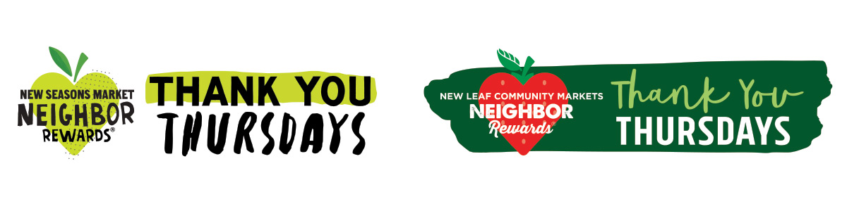 Final Thank You Thursday logos for New Seasons Market and New Leaf Community Markets Neighbor Rewards programs.